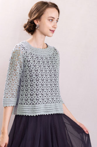 掲載の作品は色番選択の1例です。購入色番選択画面でお好みの色番、数量を選択下さい。なお、着分の材料購入で、編み図希望のお客様には編図(B4サイズ)画像データを無償提供(別途Mail添付)しますので、購入手続き最後のお客様情報を入力するページの備考欄に「着分購入、作品番号XX-XXXXの編図希望」と入力下さい。